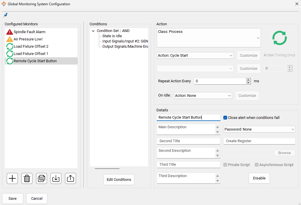 How It Works: Wire a simple pushbutton to an available input. The Global Monitoring System watches that input and triggers cycle start when pressed—but only when it’s safe. The system checks that the machine is enabled and idle before allowing the start command, preventing accidental activation.