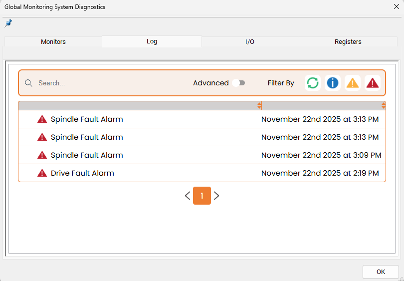 How It Works: All alarms are automatically tracked in the Global Monitoring System. The diagnostics window shows you a complete history: tracking warnings, alarms, and other items. With the built in logging database in the backend of MachPro, you never have to worry about losing your history after cycling the power of your machine.