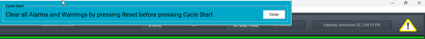 If you try to press Cycle Start with a warning active, you will get a message from the top of the screen saying to Clear all Alarms and Warnings.