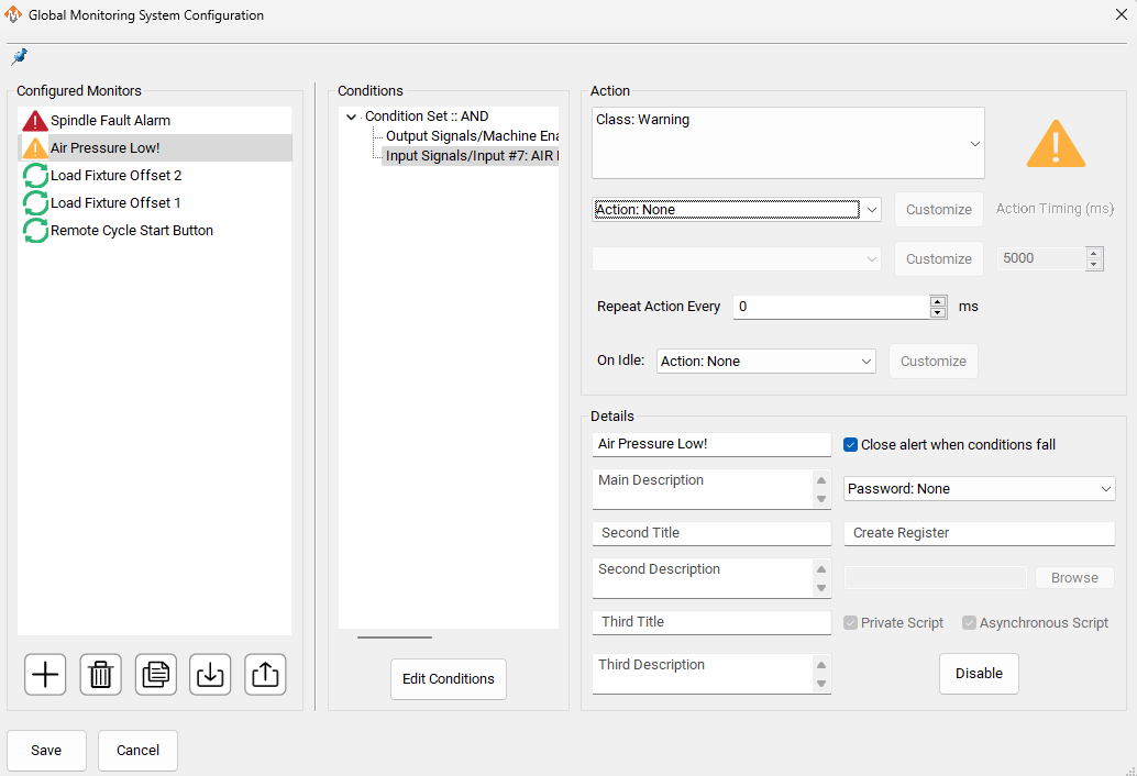How It Works: Install a pressure switch in your air line. Create a warning monitor that prevents cycle start when pressure drops. For critical protection, add a second switch at 50 PSI that stops and disables the machine immediately.